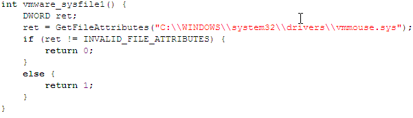The function below checks wherer the mouse driver vmmouse.sys exists in the C:WINDOWSsystem32drivers directory, in which case the operating system is running under VMWare.