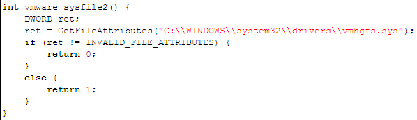 The function below checks whether the driver which enables the shared folders exists in the C:WINDOWSsystem32drivers directory, in which case the operating system is running inside VMWare.