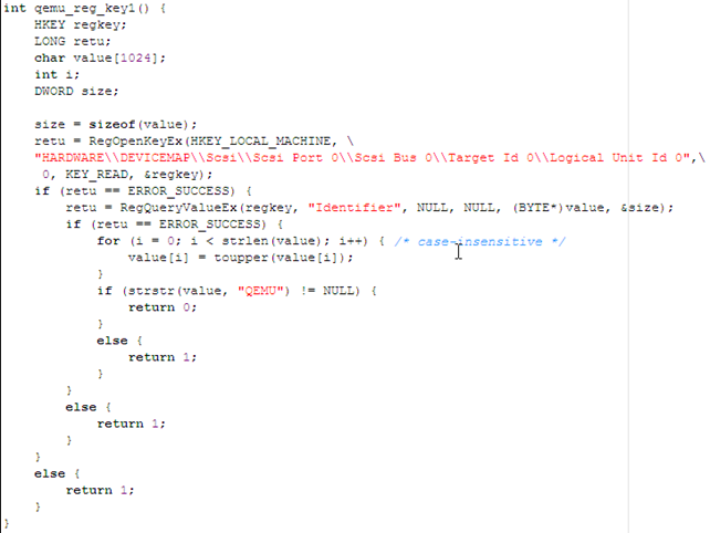 The function below checks whether the SCSI hard driver identifier contains the word QEMU, in which case the operating system is running inside Qemu.