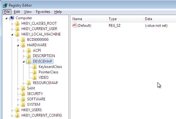 Let's now check whether the specified registry key exists in the operating system running in Qemu. We've run regedit and opened the DEVICEMAP entry, where there is no such field as Scsi, which is being checked by the previous function. Since the Scsi entry doesn't exist, that Pafish function won't be able to detect that our Windows operating system is running inside Qemu. It should be noted that the Scsi identifier is available only if SCSI disk is enabled by using the "-drive file=file,if=scsi" option in qemu. Since we're not using the SCSI interface, that option is not available under the registry and the function above won't be able to detect Qemu.
