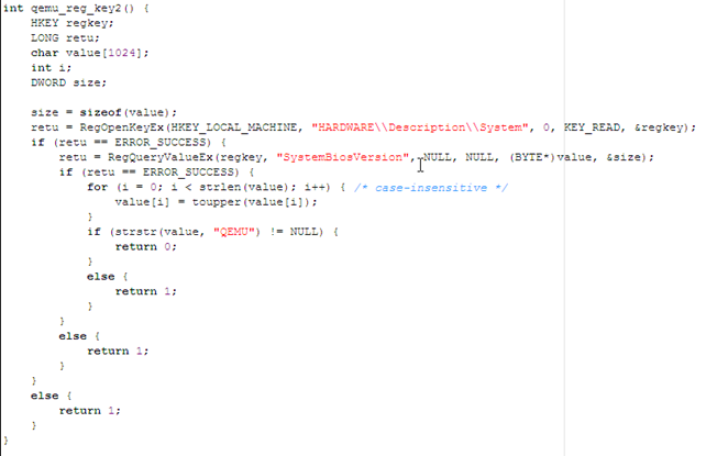 The next function checks whether the SystemBiosVersion contains the string QEMU, in which case the operating system is running inside Qemu.