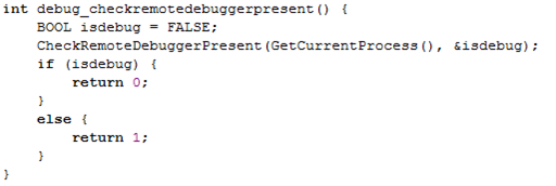 The CheckRemoteDebuggerPresent function checks whether the process is debugged by a remote debugger, which doesn't necessarily reside on a separate computer, but is a separate process.