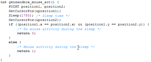 Pafish contains four methods to detect the sandbox. The first method is using a quick mouse movement, where the GetCursorPos is used to retrieve the position of the mouse cursor. The GetCursorPos has the following syntax [1], where the lpPoint parameter accepts a pointer to a POINT structure where the screen's coordinates of the cursor will be saved. The function returns nonzero if it was completed successfully, otherwise it returns zero.