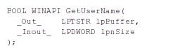 The second method that's used by Pafish to detect a debugger is using a GetUserName function that retrieves the name of the user associated with the current thread [2]. The syntax of the function can be seen below, where it's evident that a function accepts two parameters. The first parameter lpBuffer is a pointer to the buffer where the user's logon name will be saved. The buffer must be large enough to enable the whole username to be saved to the buffer, otherwise the function will fail. The second parameter lpnSize specifies the size of the lpBuffer buffer, which is overwritten upon the function's completion – the lpnSize will contain the length of the username copied to the lpBuffer buffer. The function will return a nonzero value when successful, otherwise a zero is returned and a detailed error log can be obtained by calling GetLastError.