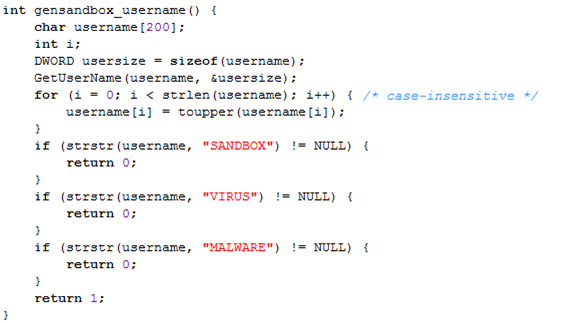 The code used in Pafish can be seen below, where we're first reserving a buffer on the stack to hold the username buffer of size 200 bytes and integer number i. After that we're calling the GetUserName, which will copy the logon username to the username buffer previously allocated. After that all the lowercase letters are changed to their upper-case letters and the name is compared to the following strings: SANDBOX, VIRUS and MALWARE. The strstr function returns a pointer to the first occurrence of the presented strings if found, otherwise it returns NULL. If the SANDBOX, VIRUS or MALWARE strings are found inside the username, the function will return 0, which specifies that the program is being run inside a sandbox. Otherwise 1 is returned, which signifies that the program is not being run in a sandbox: more specifically, that the logon username doesn't contain the strings SANDBOX, VIRUS or MALWARE.