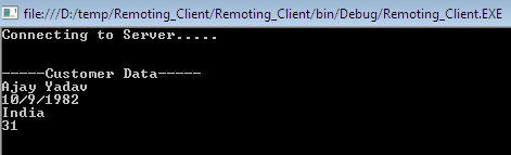 The remoting client will connect the server and ask for a customer object. For the client, you also need to add references of System.Runtime.Remoting.dll, and compile the Gen_Remoting.dll file again.