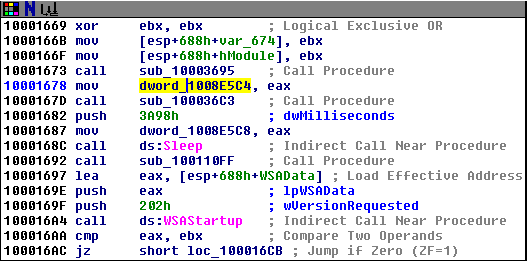 - We can notice that before instruction mov dword_1008E5C4, eax, we can see a call to function call sub_10003695. Which means that the function sub_10003695 is returning some value which is stored in eax and then moved to dword_1008E5C4. Let's see what the function sub_10003695 is doing.