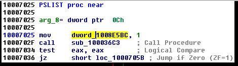 The code above is getting the OS version and then comparing it. Based on the comparison a JMP instruction will take place. A JMP instruction is a non-conditional instruction which is used to jump to a specified location. And later value is returned in eax which is what is tested in PSLIST above.