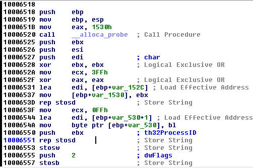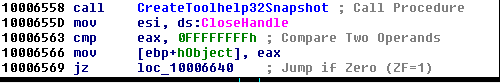 If we scroll down a bit, we can see a call to CreateToolhelp32Snapshot to take a snapshot of the specified process