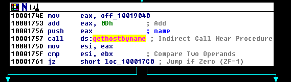 - We can see that gethostbyname is being called, but this function needs 1 parameter. That function parameter is pushed with statement Push eax. But what is in Eax? Let's backtrack, and we can see that initially string at off_10019040 is moved to eax. Let's look as to what is in off_10019040.