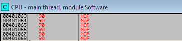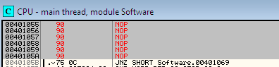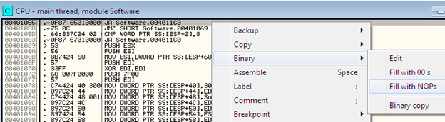 First select the Go to JA 00401055 from the context menu. You should now be on the code at location 0x00401055. Your ultimate objective is to prevent the program from hitting the error code path. This can be accomplished by changing the JA instruction to NOP (no operation), which actually does nothing. Right click the 0x00401055 instruction inside the CPU window and select "Binary" and click over Fill with NOPs as shown below:
