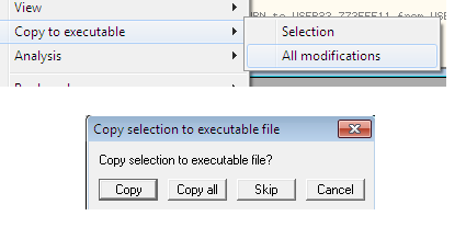Now save the modifications by right-clicking in the CPU window, clicking Copy to Executable, and then clicking All Modifications. Then hit the Copy all button in the next dialog box, as shown below: