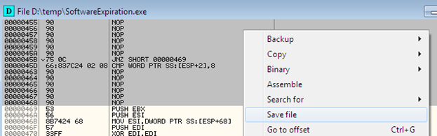 Finally, save the modified or patched binary with a new name. Now load the modified program; you can see that no expiration error message is shown. We successfully defeated the expiration trial period restriction.