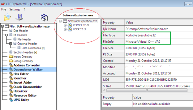 We don't know in which programming language or under which platform this software is developed, so the first task is to identify its origin. We can engage CFF explorer, which displays some significant information such as that this software is developed by using VC++ language, as shown below.