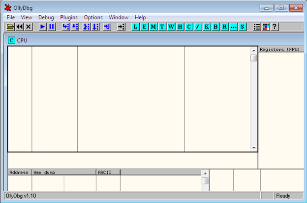 Such tasks can also be accomplished by a powerful tool, IDA Pro, but it is commercial and not available freely. OllyDbg is not as powerful as IDA Pro, but it is useful in some scenarios. First download OllyDbg from its official website and configure it properly on your machine. Its interface looks like this:
