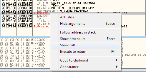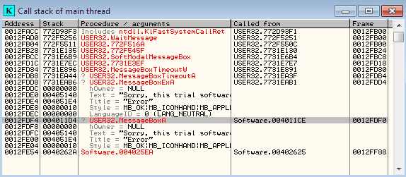 Okay. Now view the call stack by pressing the Alt+ K. Here, you can easily figure out that the trial error text is a parameter of MessageBoxA as follows: