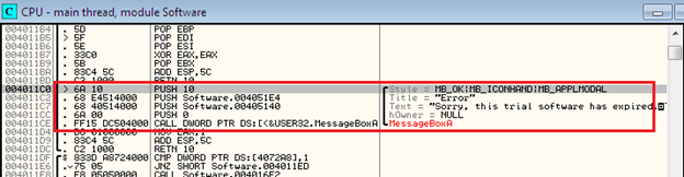 Unfortunately, we don't have the actual source code, so how can we inspect the assembly code? Here the error message "Sorry, this trial software has expired" might help us to solve this problem because, with the help of this error message, we can identify the actual code path that leads to it.