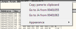 We have now identified the actual line of code that is responsible for producing the error message. Now it is time to do some modification to the binary code. The context menu in the previous figure shows that both 00401055 and 00401063 contains JA (jump above) to the PUSH 10 used for message box.