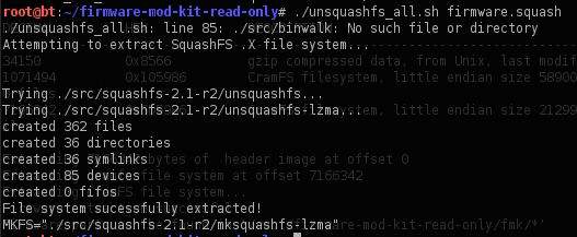 This toolkit contains various tools, such as unsquash_all, uncramfs_all, extract-sh, build-firmware.sh, firmware-modification-kit.sh, etc., for different type of activities. Let's try to extract files from the above filesystem, firmware.squash. We'll use a tool called unsquash_all.sh, as it's a squash filesystem: