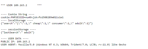 The script retrieves the user's public IP address, his cookies, values stored in local and session storage and his user agent and inserts them in a text file in which separate users and separate pieces of data are line-separated. From what we have gathered here – we can possibly hijack the user's session from the PHPSESSID cookie. We can possibly learn about the capabilities and vulnerabilities of the user's browser (newer browsers try to present themselves as different or multiple browsers to prevent being sniffed), and use the information stored in Web Storage in any way we like – the information there could have consisted of sensitive emails, a famous blogger's unpublished articles written in StackEdit or other useful pieces of data.