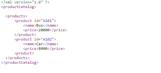 Therefore, XML specification is a set of norms, defined by the W3C. Unlike HTML, XML does not have fixed number of pre-defined tags. Instead, it is a meta-language that allows for creation of other markup language. For example, the following specimen XML file demonstrates a product catalog as:
