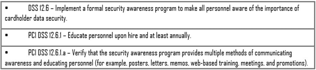 Drafters of a security awareness program need to be familiar with the latest security training requirements. By way of illustration, the PCI DSS v3.2 (Payment Card Industry Data Security Standards) became mandatory, not best practices, on February 1, 2018.