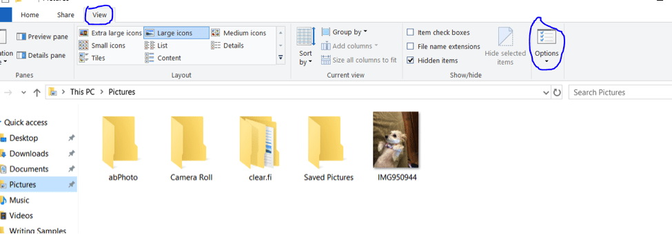 - Within Windows Explorer, click the Organize button and click on the View tab to select Options: