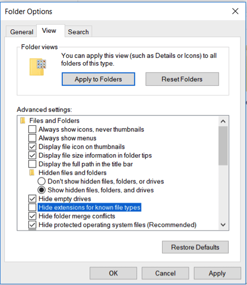 - You will be presented with a Folder Options window. Uncheck “Hide extensions for known file types,” click Apply and OK.