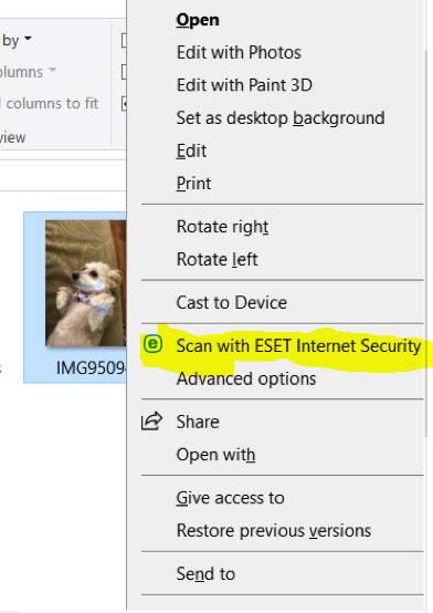 In this example, I am using ESET Endpoint Antivirus. Simply right-click on the file with the suspect file name. Select “Scan with ESET Internet Security” and if the file is an executable, your antivirus solution will let you know.