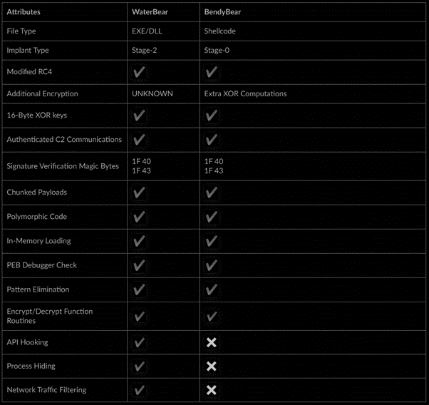 BendyBear malware has blocks of code similar to the WaterBear malware family (active since 2009), and often deployed against East Asian governments such as Japan, Taiwan and Hong Kong. Because of this, the BendyBear shellcode seems to come from the same source of WaterBear and is potentially linked to the BackTech APT group.