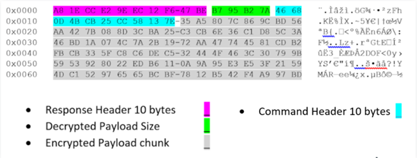 Figure 5 shows an example of one payload chunk that is sent from C2 to the stager (shellcode running).
