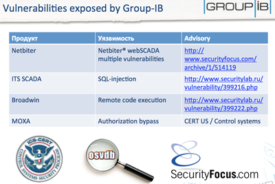 - Vulnerabilities in industrial sector. The interest of hackers can be divided into financial fraud in industrial (especially in oil and gas sector) and remote attacks of SCADA/ICS infrastructures. The first one is traditionally organized in cooperation with internal employees of industrial companies or only by them. They can use vulnerabilities in billing software and to modify the values of it, which helps them to make lots of dirty business. Group-IB discovered this trend in petroleum sector, especially in retail network and branches companies; in many cases they need special malware for doing it. Most of the vulnerabilities related to such segment is in frontends of SCADA applications and its WEB-application modules: