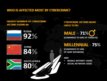 The highest numbers of cybercrime victims are located in Russia, China and South Africa, countries where malicious activities are very popular.