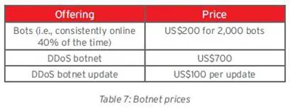 To arrange DDoS attacks, criminal need to use specially crafted bots and botnets. This means that he must obtain access to a huge quantity of machines and installs a daemon on it using his DDoS bot kit. In the following table are the reported costs for DDoS service renting and botnet renting, which is extremely cheap.