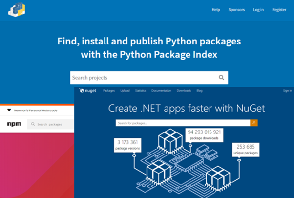 Because some projects have sensitive code or are private, companies use private libraries that are only available inside a private or internal package repository. Nonetheless, when the applications are built, the company’s developers mix the private with public libraries then downloaded from public packages portals such as npm, PyPi, NuGet and so on.