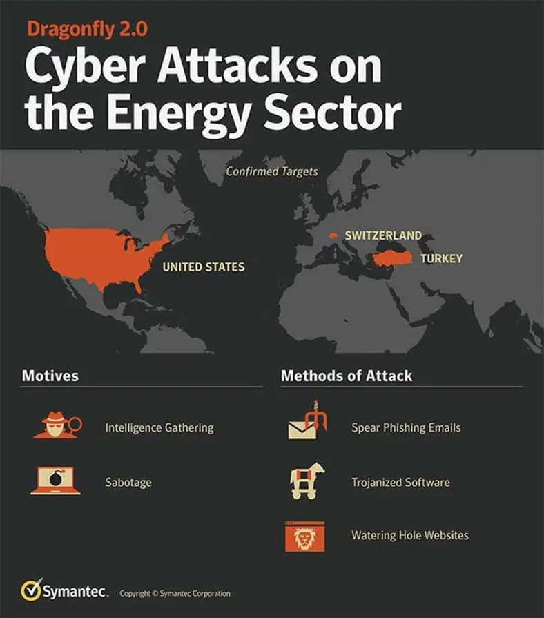 "The energy sector in Europe and North America is being targeted by a new wave of cyber-attacks that could provide attackers with the means to severely disrupt affected operations. The group behind these attacks is known as Dragonfly." reads the analysis published by Symantec. The group has been in operation since at least 2011 but has re-emerged over the past two years from a quiet period following exposure by Symantec and a number of other researchers in 2014. This "Dragonfly 2.0" campaign, which appears to have begun in late 2015, shares tactics and tools used in earlier campaigns by the group."