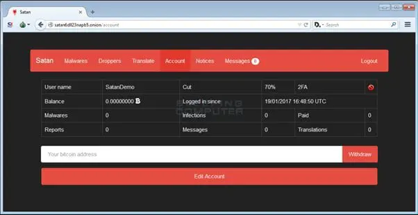 Figure 3: Satan RaaS Dashboard (Bleeping Computer [9]).