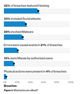 - Errors and web application attacks are common across most industry sectors. Overall, 52% of breaches were from hacking, 33% involved social attacks and 28% malware