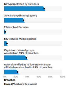 - Insider threat is still an issue but not as prevalent as external threats. The DBIR shows that 69% of attacks are from external actors with 35% being insiders; 5% used multiple parties (collusion)