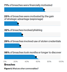 - Money makes the world (and cybercrime) go around, with financial incentives being behind the majority of the breaches. The top reason behind a cyberattack on data is financial gain; in 71% of cases, espionage is behind 25% of breaches