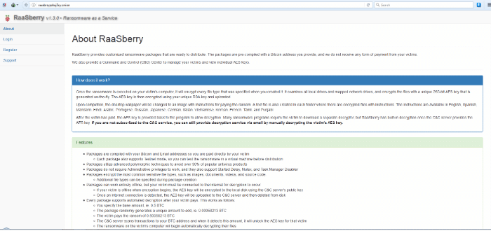 After the victim has paid, the AES key is returned to the program to allow decryption. Many ransomware programs require the victim to download a separate decryptor, but RaaSberry has built-in decryption once the COMMAND AND CONTROL server provides the AES key. If you are not subscribed to the COMMAND AND CONTROL service, you can still provide a decryption service via email by manually decrypting the victim's AES key. This website has several sections: About, Login, Register and Support. The About section describes how you can create your personal ransomware.