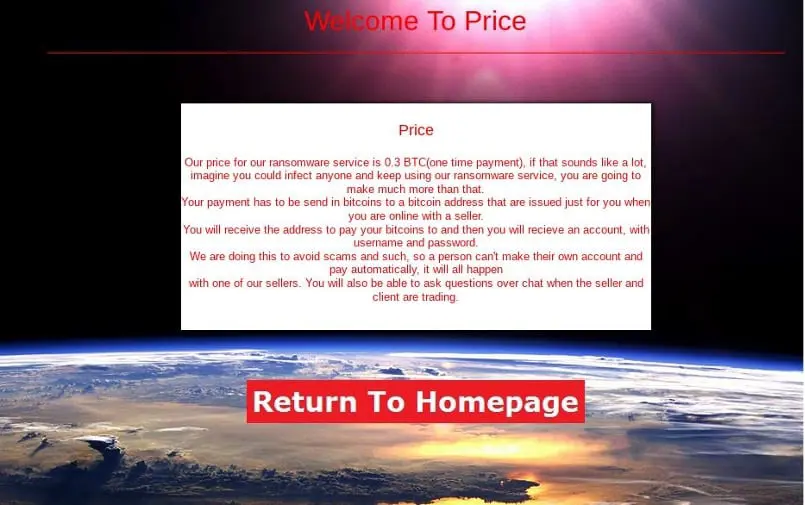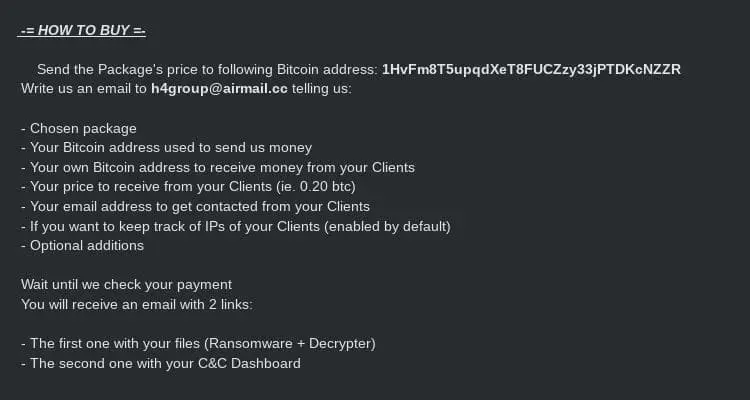 Unlike the previous RaaS, this one offers a fixed-rate service at 0.3 BTC. When the customer pays the quote to the bitcoin address indicated in the mail, he obtains his credentials to enter the personal section.