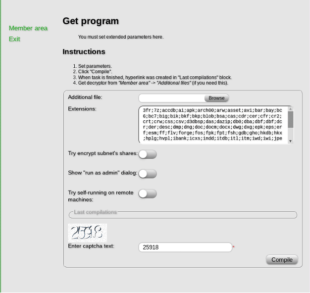 Users can configure their ransomware when registering at the website by choosing a set of features. This platform seems to be one of the more complete because it allows specifying which extension of the files to encrypt.