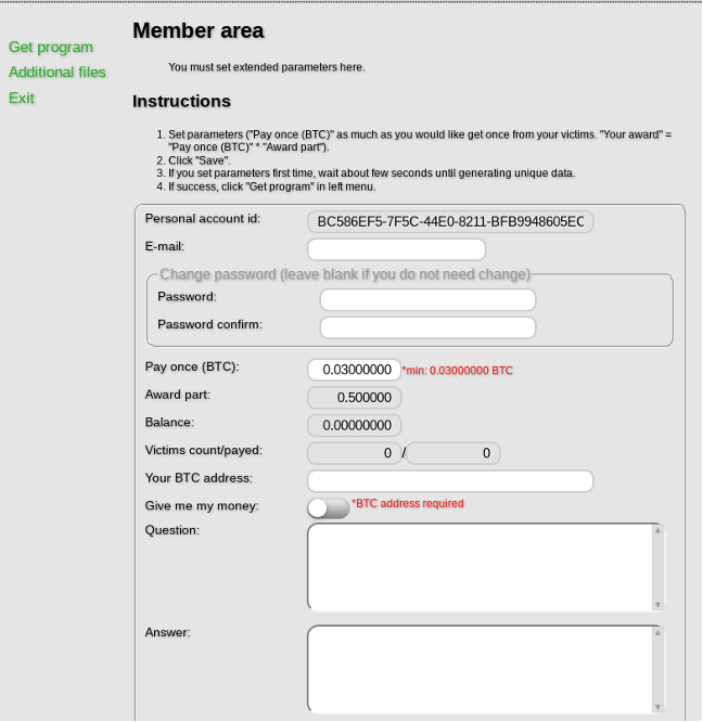 Once the users register to the platform and purchase a new package, the platform assigns them a personal bitcoin address. They can control statistics about the ransomware campaign and check their earnings.