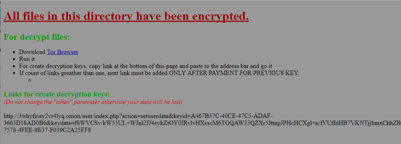 Upon completion, the desktop wallpaper will be changed to an image with instructions for paying the ransom. A text file is also created in each folder, with encrypted files with instructions. The instructions are available in English, Spanish, Mandarin, Hindi, Arabic, Portuguese, Russian, Japanese, German, Italian, Vietnamese, Korean, French, Tamil, and Punjabi.