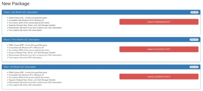 In this dashboard, you can purchase new packages that include, for each plan, the same ransomware but a different subscription length to Command and Control. As shown in the following figure, there are several plans: