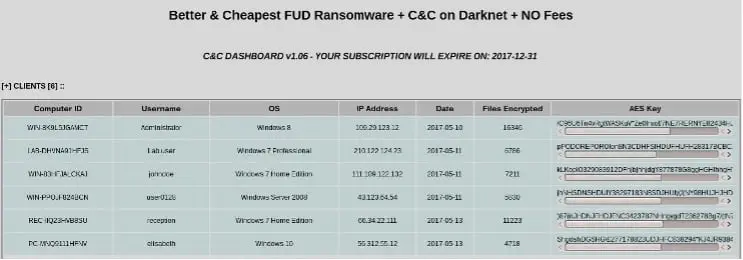The Ranion team's website shows an example of the COMMAND AND CONTROL dashboard. In the next figure, we can observe the subscription time and when it expires, as well as the infected machines classified by Computer ID, the username of the victim, operation system, IP Address, date of infection, number of encrypted files and the relative encryption key.