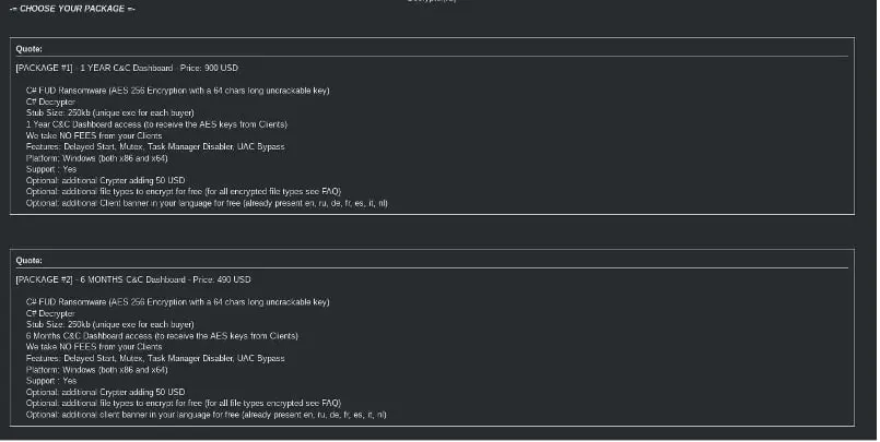 In this dashboard, users can purchase new packages that include, for each plan, the same ransomware but a different subscription time to the Command and Control. As shown in the next figure, there are two plans in which the ransomware is the same, but there is a different subscription time to the COMMAND AND CONTROL dashboard, with different prices.