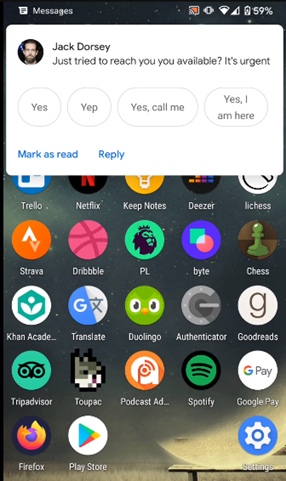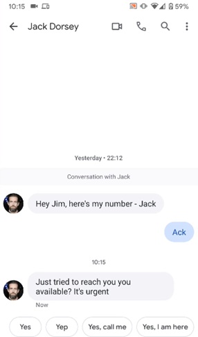 “Say I work at Twitter. I have Jack Dorsey, Twitter CEO, saved to my phone’s contacts. I have a previous legit conversation with Jack. Right now, you can send me a message from Jack, which will appear in that conversation history, like this:”