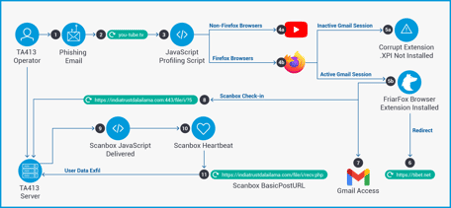 FriarFox is a complete browser extension capable of exfiltrating data from end-users Gmail Accounts and performing total control of the victim’s web browser. The usage of browser extensions to target the private Gmail accounts of users combined with the delivery of Scanbox malware demonstrates the malleability of TA413 when targeting communities.